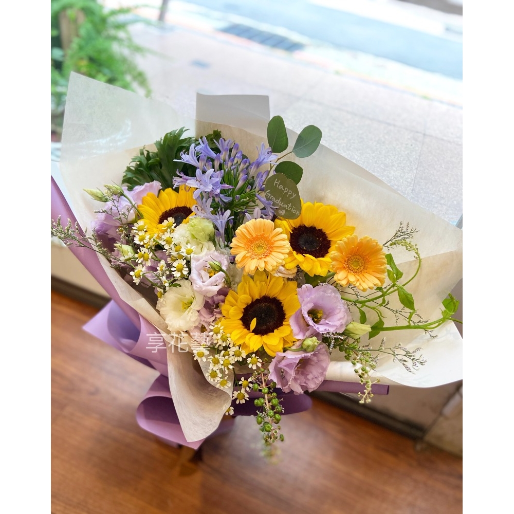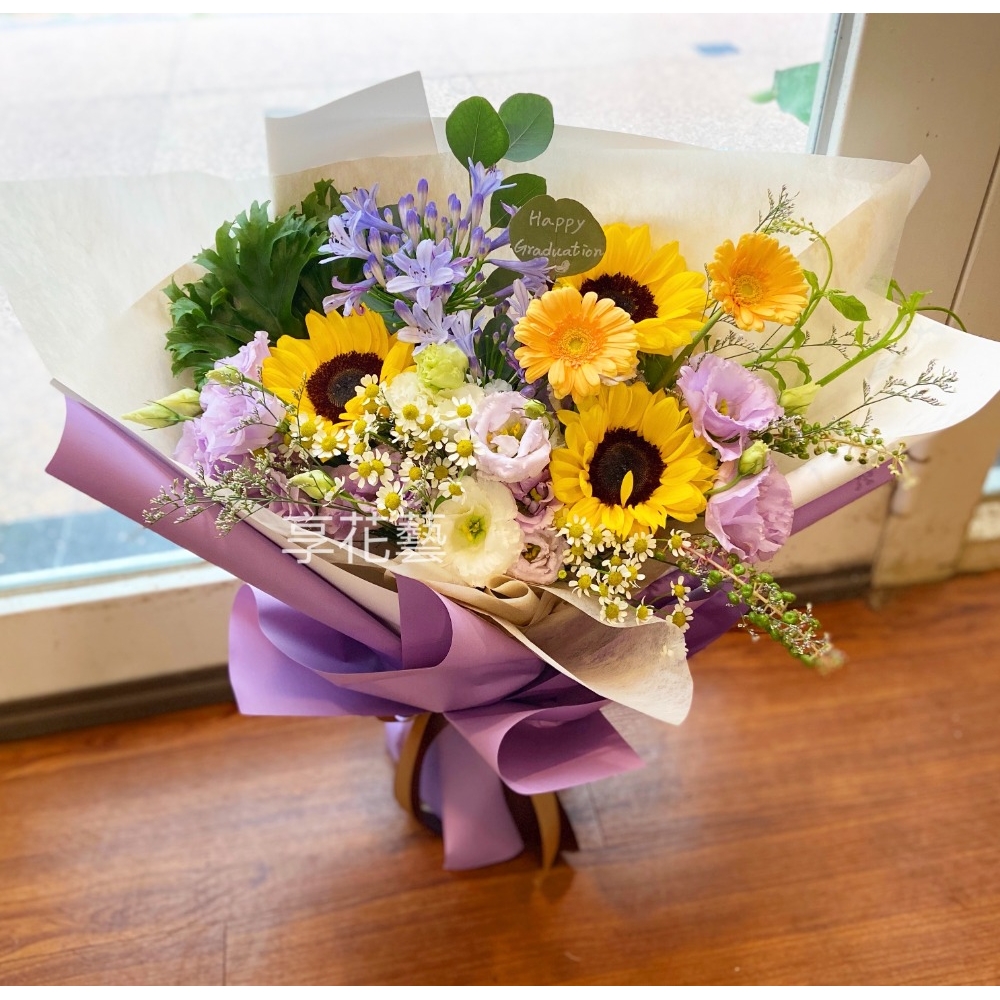 帶著光芒與氣勢的亮眼鮮花束。享花藝也提供了客製化服務,若有需要可直接電話聯絡我們。來自向日葵的美好祝福
