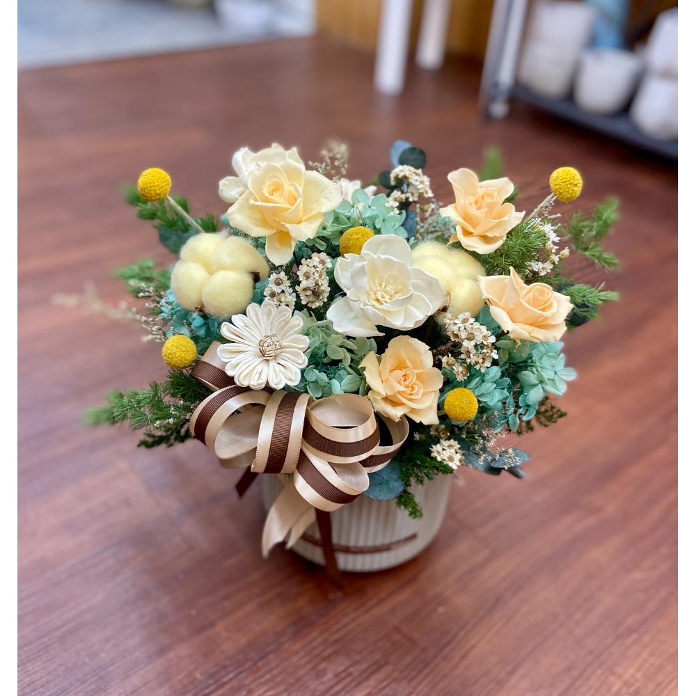 乾燥花材有可能缺貨或品質不佳的情形,如有此狀況發生,花藝設計師將在不影響花藝整體美感的情況下,用等值以上的乾燥花材為您設計調整。